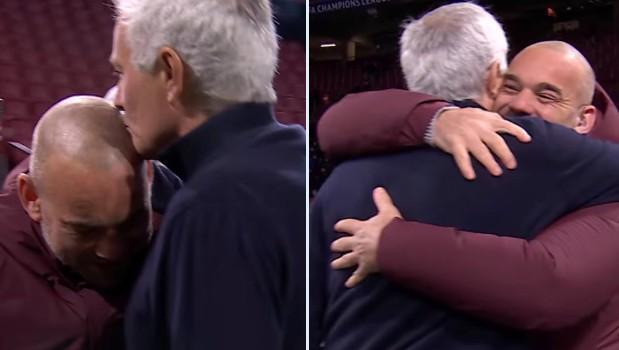 穆里尼奥分别与斯内德(2009/10赛季在国米共事)以及布拉鲁兹(2006/07赛季在切尔西共事)拥抱致意。