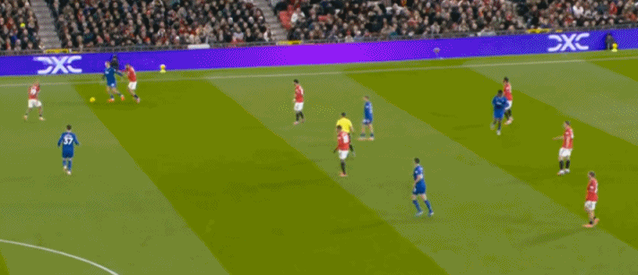 这里存在的一个变量,是此前的界外球进攻当中,埃弗顿的双中卫都来到了前场,所以在埃弗顿把球送回后场运转的时候,曼联的前场球员先是没有进行逼抢,随后在基恩后撤的时候,卡塞米罗随之移动,从而露出了他和布鲁诺之间,可以联系到霍尔的线路:
