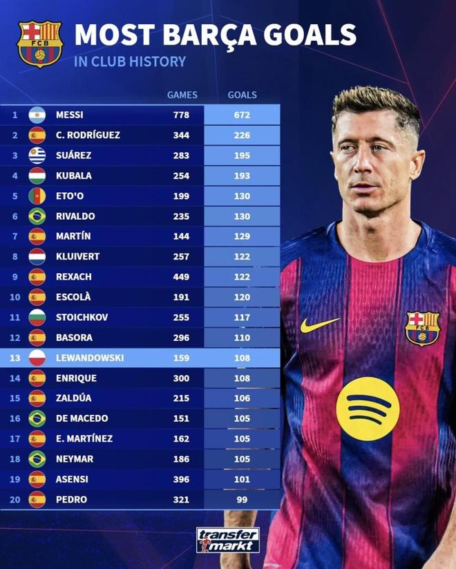 最近一场西甲联赛里,巴萨客场4-2拿下塞尔塔,37岁的莱万多夫斯基上演帽子戏法,一脚点球、一次门前包抄再加一次角球中的头球,把比赛彻底踢成了自己的舞台。 这一晚过后,他身穿巴萨球衣的正式进球数来到108球,正式超越内马尔、马丁内斯和德马塞多,在俱乐部历史射手榜上继续往前挤。 对塞尔塔个人生涯进球也涨到8球,“苦主”标签越贴越牢。