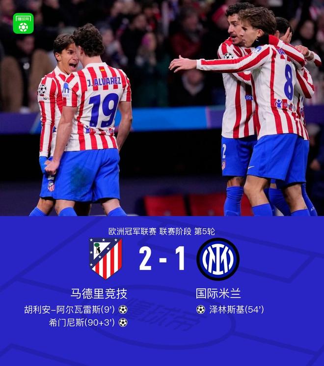 北京时间11月27日欧洲冠军联赛联赛阶段第5轮,马德里竞技对阵国际米兰。上半场,阿尔瓦雷斯破门。下半场,博尼助攻,泽林斯基推射扳平比分。伤停补时阶段,格列兹曼开出角球,希门尼斯高高跃起头槌完成绝杀。全场比赛结束,马竞2-1击败国米。